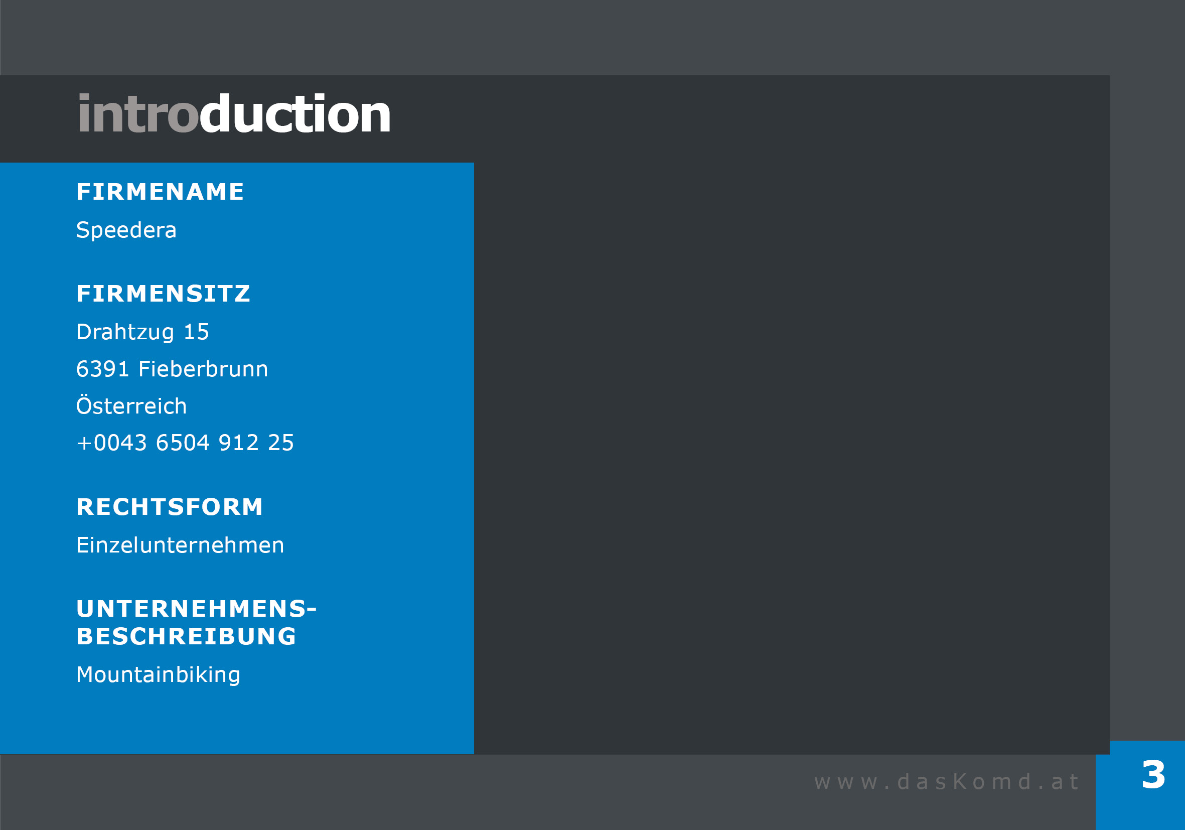 In dem zweiten Schuljahr ist eines der wichtigsten Projekte eine eigene imaginäre Firma zu gründen. Ich entschloss mich dazu eine MTB Firma namens Speedera zu gründen. Speedera ist eine einzigartige Mountainbike Firma die Konfigurierbare Bikes anbietet und Einzelteile selber produziert, somit kann sich jeder sein Traum Mountainbike kaufen mit allen Features.